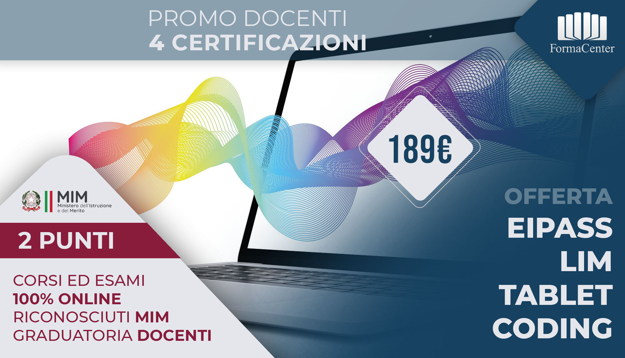 N.B.: Per coloro i quali si sono iscritti con la vecchia promozione EIPASS (prima del 20/09/2023 ore 17:00) le video lezioni non sono incluse e per prenotarsi agli esami sarà necessario inviare una e-mail ad info@formacenter.it.